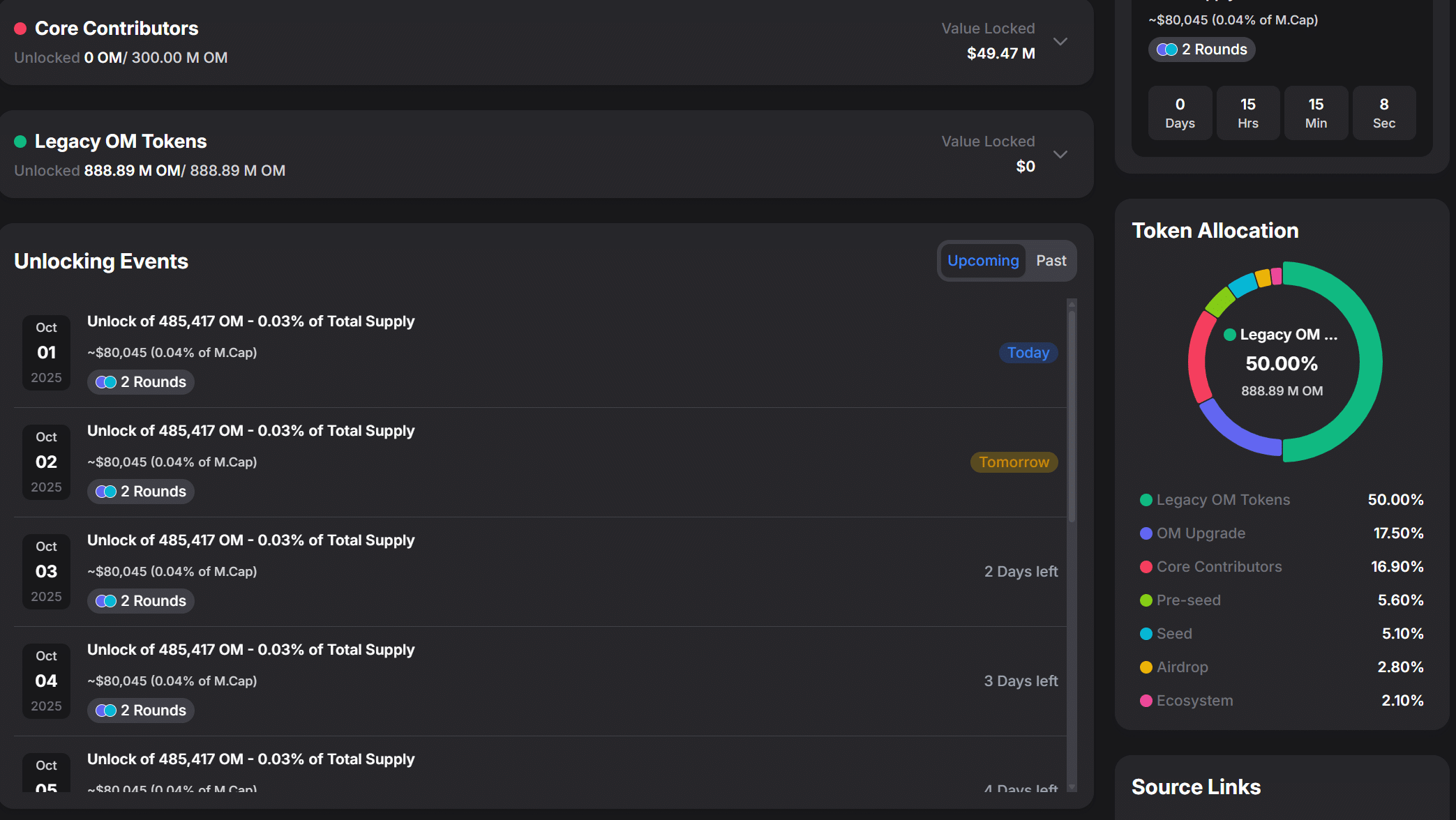 Mantra faces steady sell pressure as tokenomics tilt against it. From Oct. 1–8, daily unlocks of 485,417 OM , about $80,000, or 0.03% of supply, will hit the market. Half the supply already comes from legacy OM tokens, and another 16.9% sits with core contributors whose vesting schedules loom in the background.