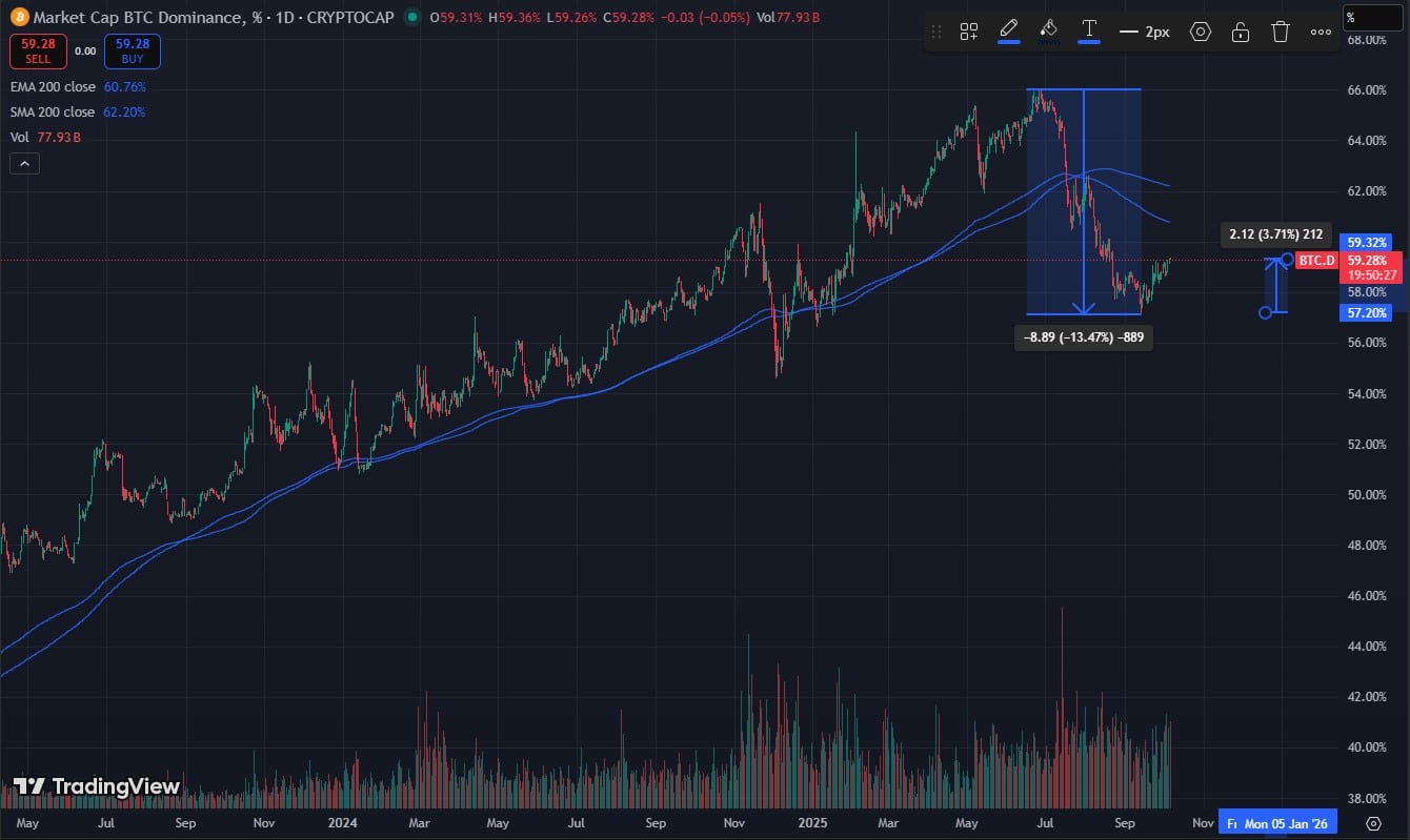 Is Bitcoin about to steal the spotlight again? As the FOMC meeting looms, investors are fleeing risky altcoins and piling into the king of crypto. Bitcoin dominance just climbed past 59%, its highest level in months, as traders brace for what could be another rate cut in November.