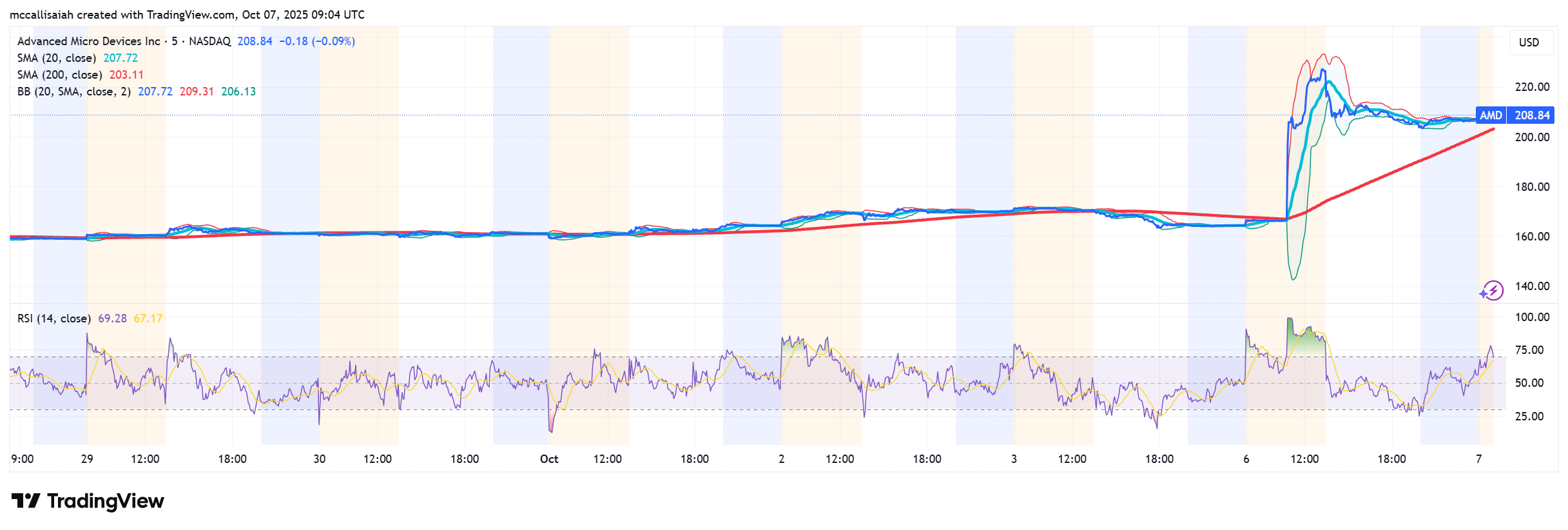 AMD shares jumped +35% at the open, trading near $204, as investors priced in the deal’s long-term significance. The agreement grants OpenAI up to 160 million share warrants, roughly 10% of AMD’s equity, if certain rollout milestones are met, according to filings.