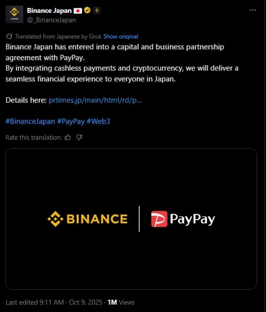 This marks the first step in a broader partnership between Binance and PayPay. According to the announcement, in the future, users will also be able to withdraw crypto directly into their PayPay accounts.