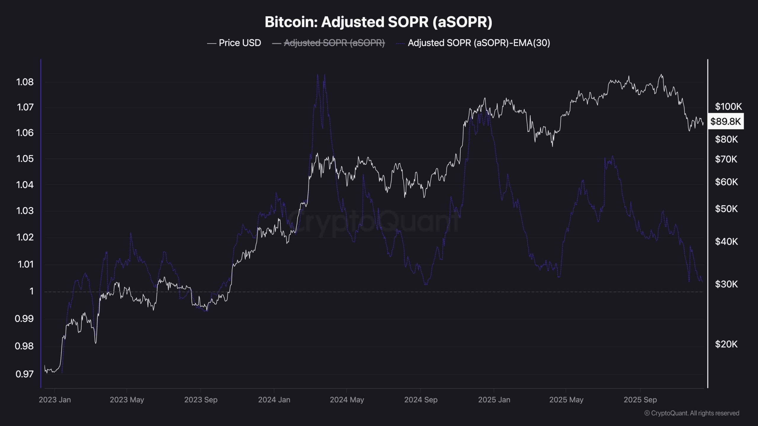 Bitcoin’s Adjusted SOPR is teasing with the 1.0 level, which is a key threshold. When aSOPR drops below 1, it means coins are being sold at a loss, signaling loss realization by the average market participant. Historically, dips below 1 during corrections mark capitulation phases where weaker hands finally exit. That often leads to a local bottom shortly after.