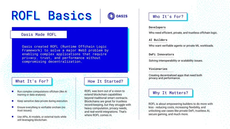 ROFL essentially functions as a decentralized TEE cloud, providing verifiable integrity to all computations. Agents execute inside secure enclaves that generate tamper-proof cryptographic attestations. And everything is verifiable on-chain. For sensitive AI workloads, ROFL processes data confidentially while ensuring correct execution.