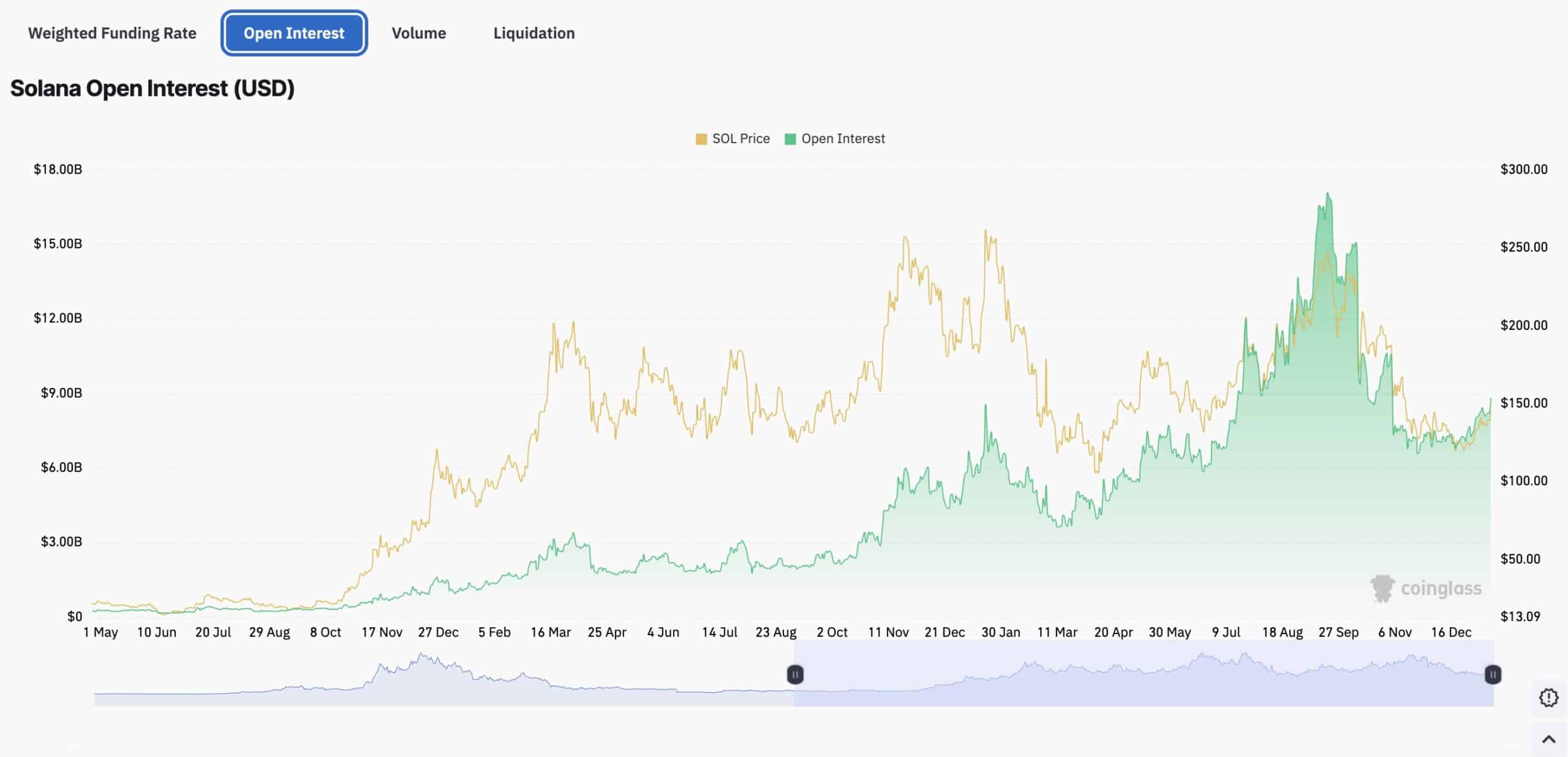 CoinGlass data puts Solana’s futures open interest at about $8.7Bn, with nearly $19.7Bn in futures trading volume over the past 24 hours.