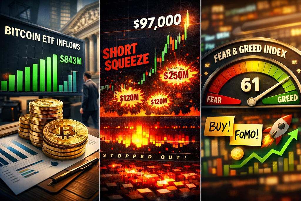 Three forces defined this move. First, spot Bitcoin exchange-traded funds recorded their largest single-day inflow in months, with more than $843 million entering the market. Second, a powerful short squeeze in derivatives markets forced over $680 million in short positions to unwind, accelerating upside momentum as Bitcoin approached the psychologically significant $97,000 level. Third, market sentiment improved decisively, with the Crypto Fear and Greed Index climbing to 61, its first reading in “Greed” territory since October.