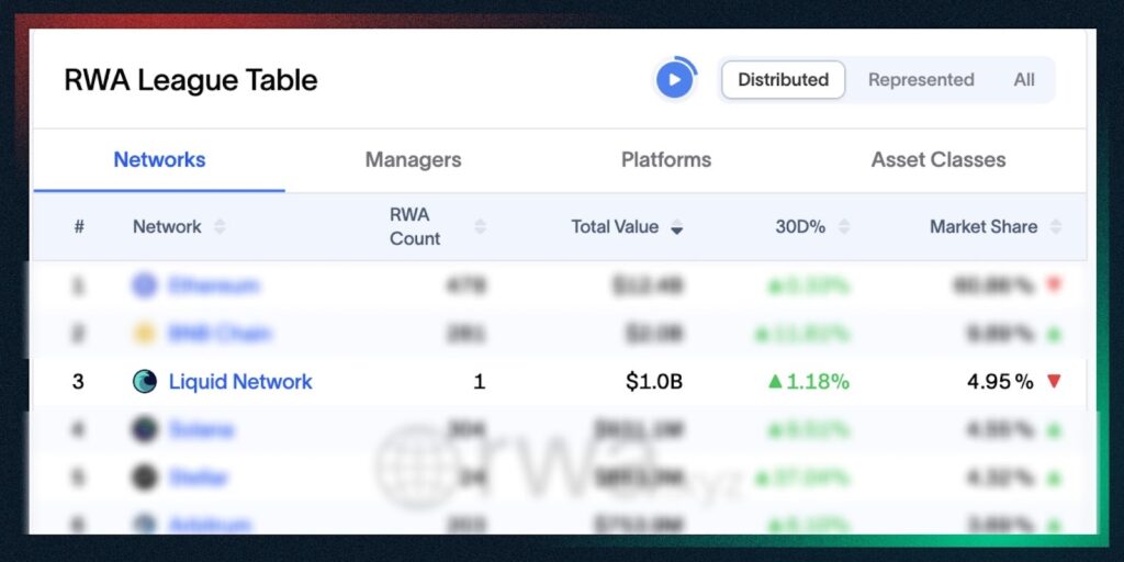 According to RWA.xyz, the industry-standard analytics platform for tokenised assets, Liquid is already the world’s third-largest blockchain for distributed real-world assets (RWAs), behind only Ethereum and BNB Chain.