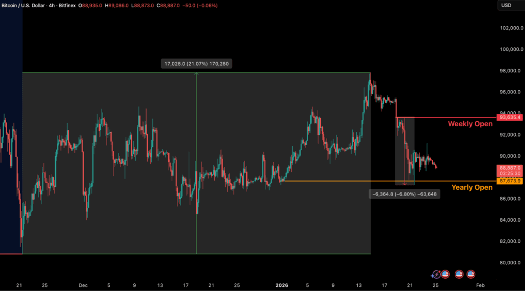 Bitcoin’s attempt to break higher has stalled, with the price failing to hold above the $95,000–$98,000 resistance zone and slipping back into its established range. After peaking at $97,850 in mid-January, BTC retraced more than 10 percent, falling below the yearly open as spot buying momentum faded and ETF outflows intensified. The rejection of any upward gains has taken place near the short-term holder cost basis, highlighting a fragile equilibrium, where downside continues to be absorbed but upside progress is consistently met by distribution from prior-cycle buyers. Derivatives positioning has reset in an orderly manner, and the volatility response remains confined to the very short end of the curve, suggesting event-driven caution rather than a broader regime shift. In the absence of renewed spot and ETF demand, Bitcoin is likely to remain range-bound, with consolidation prevailing until a clearer demand catalyst emerges.