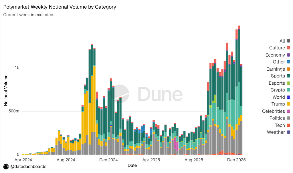 Today, markets span across a wide range of categories. Notional volume remains elevated, with participation distributed across multiple domains.