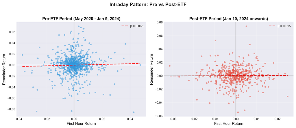 Figure 1: Power Hour vs Main Session Returns — Pre-ETF (left) shows no relationship (β ≈ 0), while Post-ETF (right) shows clear mean reversion (β = -0.566, p = 0.0024). The red regression line reveals the pattern emergence.
