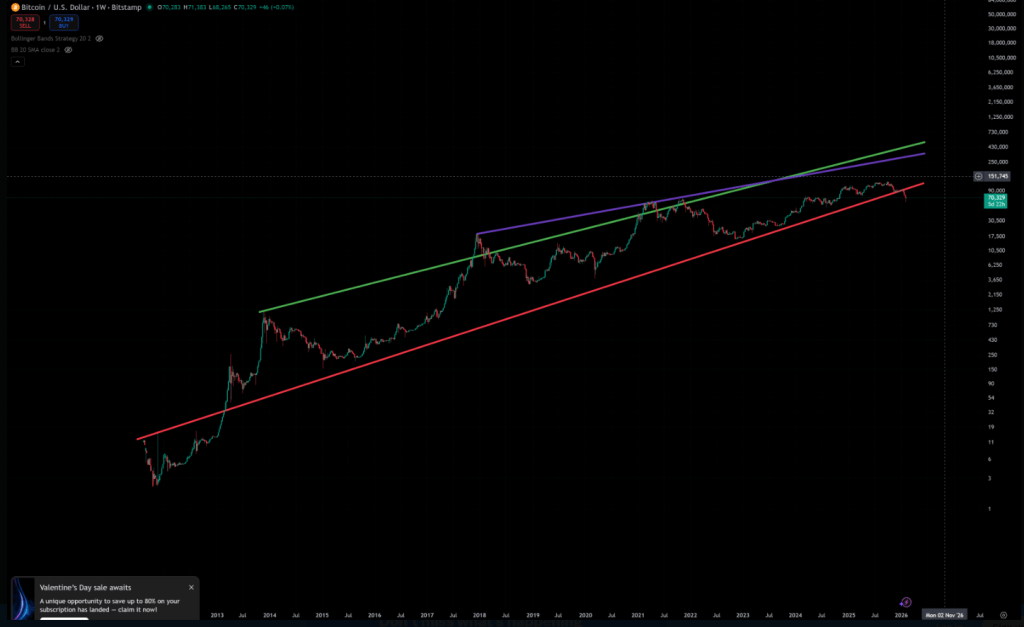 Riley bases part of his prediction on long-term trendlines. According to him, Bitcoin’s price has slipped below significant trendlines drawn over the past decade.