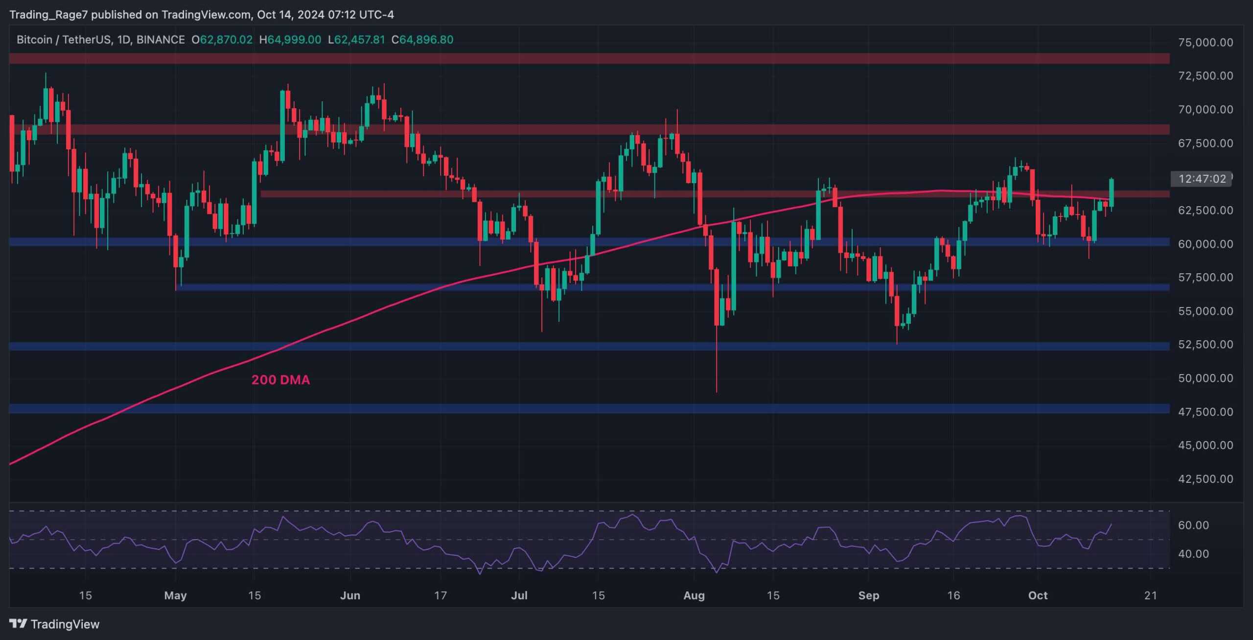 However, today’s price action suggests the consolidation period is over, as the daily candle has broken through the 200-day moving average and the $64K resistance level.