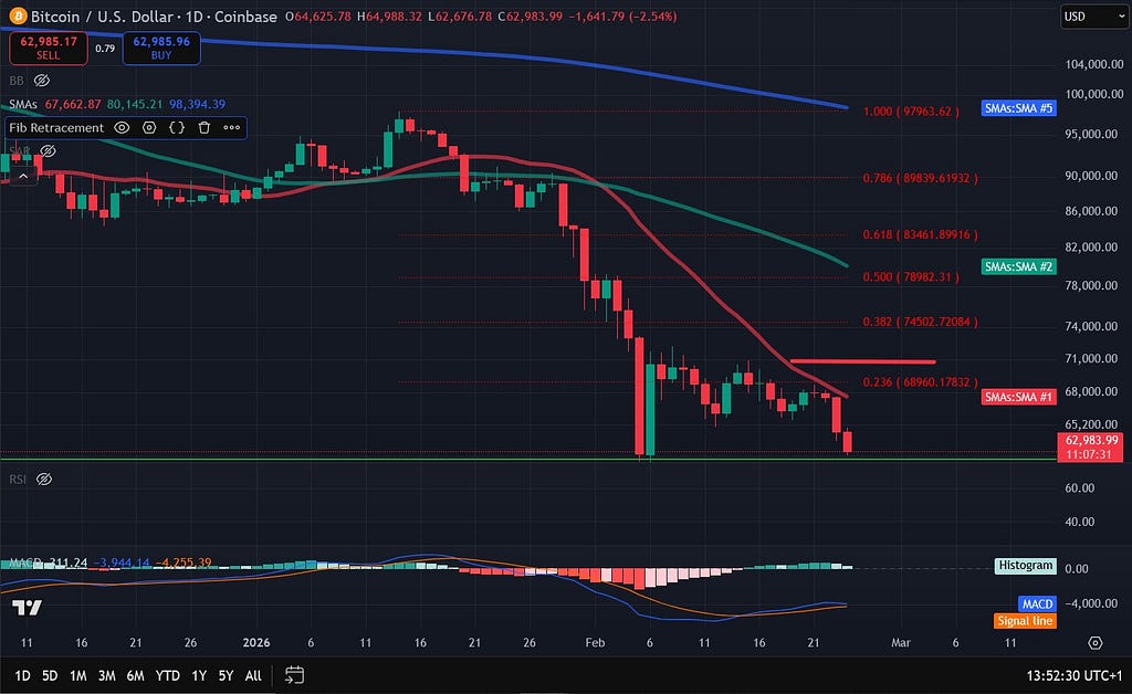 Bitcoin (BTC) extended its recent downturn after falling to $65,000 on Monday as concerns around tariffs and AI investments dented investor confidence. The flagship cryptocurrency dropped another 5% to a low of $62,709, moving to $63,174 after reclaiming $63,000. The price is down 7% every week, trading around levels last seen on February 6.
