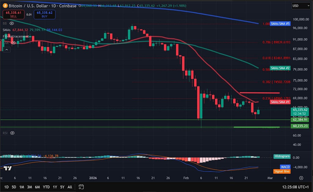 According to analysts, Bitcoin is stabilizing after a corrective phase, although it still trades below its short-term trend pivot near the mid-Bollinger band, located near the $67,000 mark. This is the zone that separates a relief rally from a sustained recovery attempt. Momentum indicators are also showing an improvement from oversold conditions, while the Relative Strength Index (RSI) has recovered from sub-30 levels recorded earlier in February. However, the RSI remains below 50, indicating that bulls have yet to establish complete control. If the latest recovery maintains momentum, it could reclaim the $70,000 mark, increasing investor confidence that the bearish trend is reversing. However, failure to reclaim the level could leave Bitcoin vulnerable to another pullback towards the $60,000 mark.