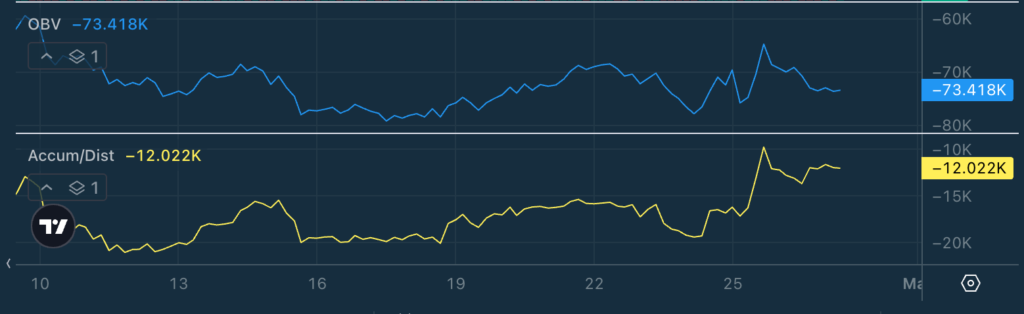 When A/D starts flattening while OBV is still falling, it can be an early sign of quiet accumulation – the big players positioning at these levels before it shows up in price. It doesn’t mean the bottom is in, and it’s not a trade signal on its own. But something is shifting beneath the surface.