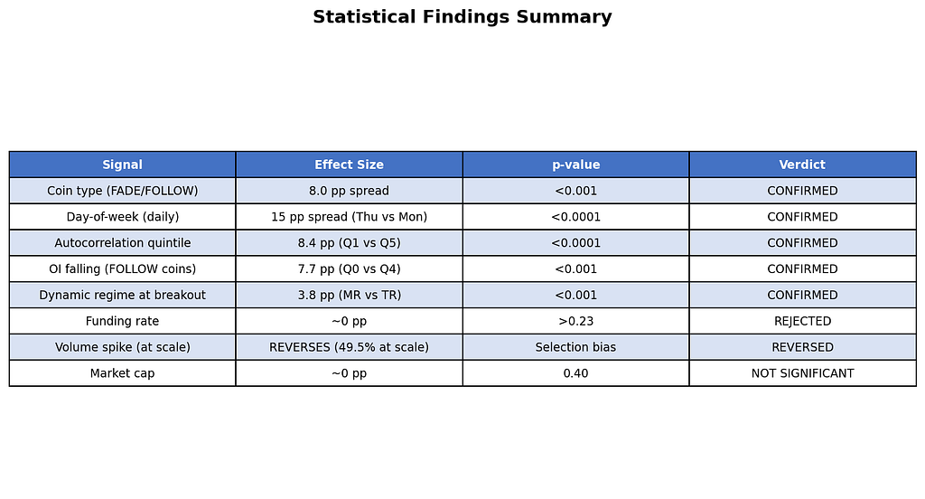 Myth 3: “Funding rate predicts breakout quality.” Negative funding + upward breakout = short squeeze = strong follow-through, right? Wrong. Every funding rate test produced p-values above 0.23. Zero predictive power. Funding reflects current positioning sentiment, not breakout quality.