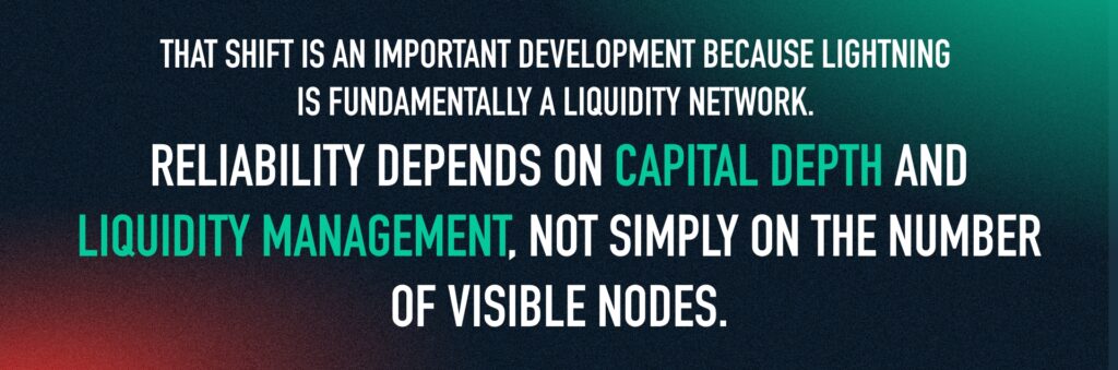 That shift is an important development because Lightning is fundamentally a liquidity network. Reliability depends on capital depth and liquidity management, not simply on the number of visible nodes.