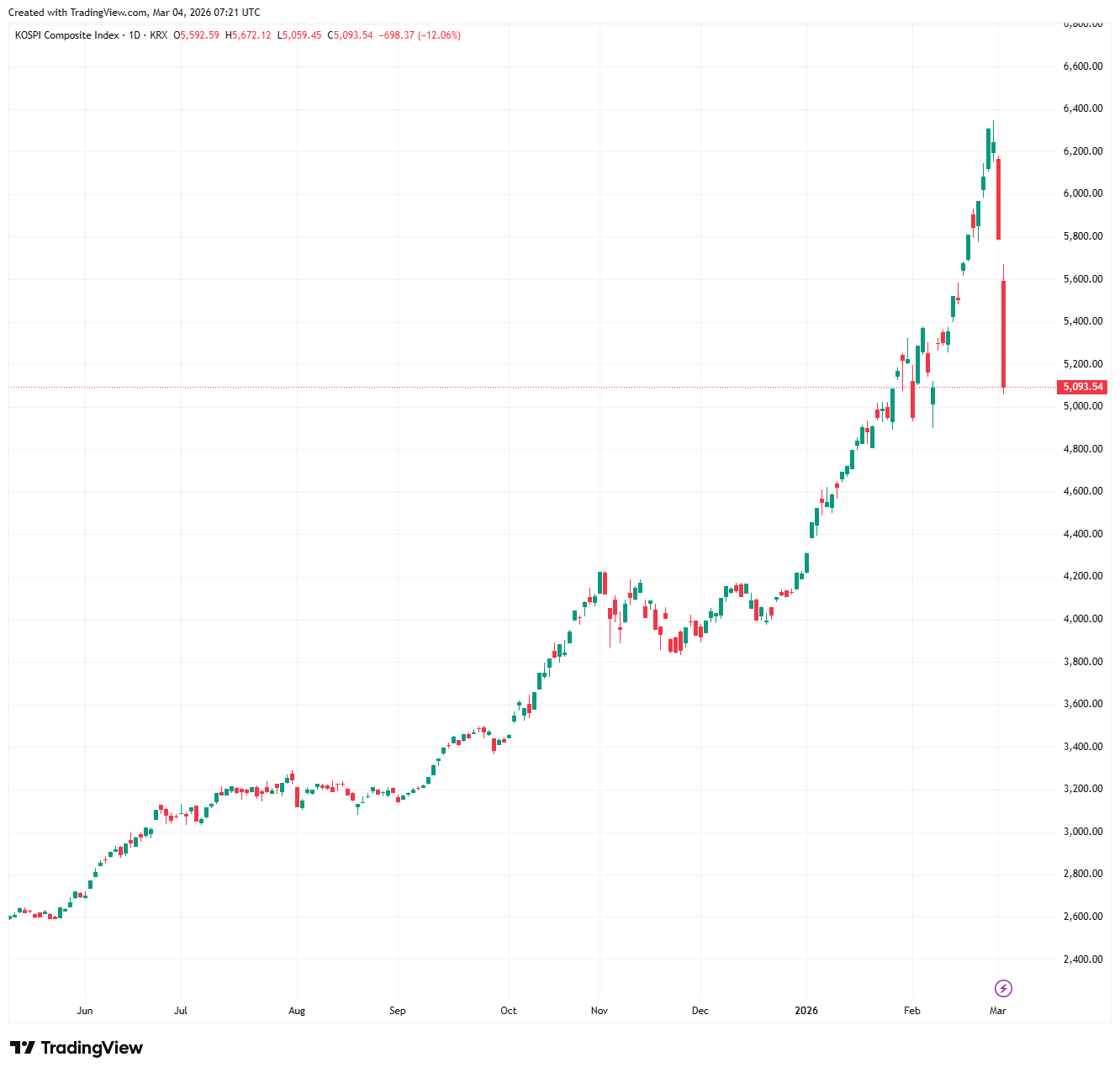 The benchmark market index in South Korea, KOSPI, saw a massive decline during the last trading session, dropping by more than 12%. Undoubtedly, this last drop represents a significant escalation from earlier market movements and highlights the increasing volatility in local equity markets amid the war in Iran.