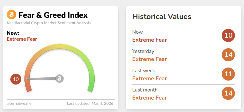 The weekend started with a sharp price dip as geopolitical tensions spiked. Markets reacted instantly, sending the Fear and Greed Index crashing to 10/100. This is a level of extreme panic we have not seen in years.