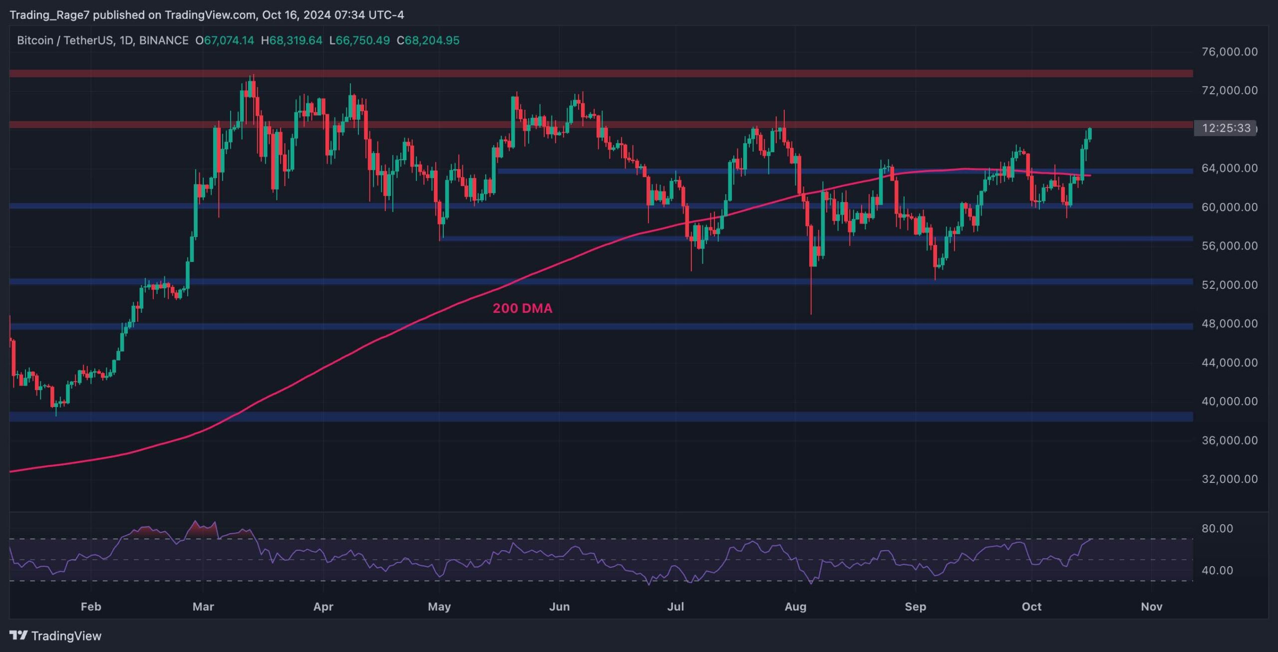 On the daily chart, the asset has been rallying aggressively after breaking above the 200-day moving, located around the $64K level. Currently, the market is testing the key $69K resistance level, the sellers’ last resort, as a breakout would lead to a new all-time high and a potentially long-term rally for Bitcoin.