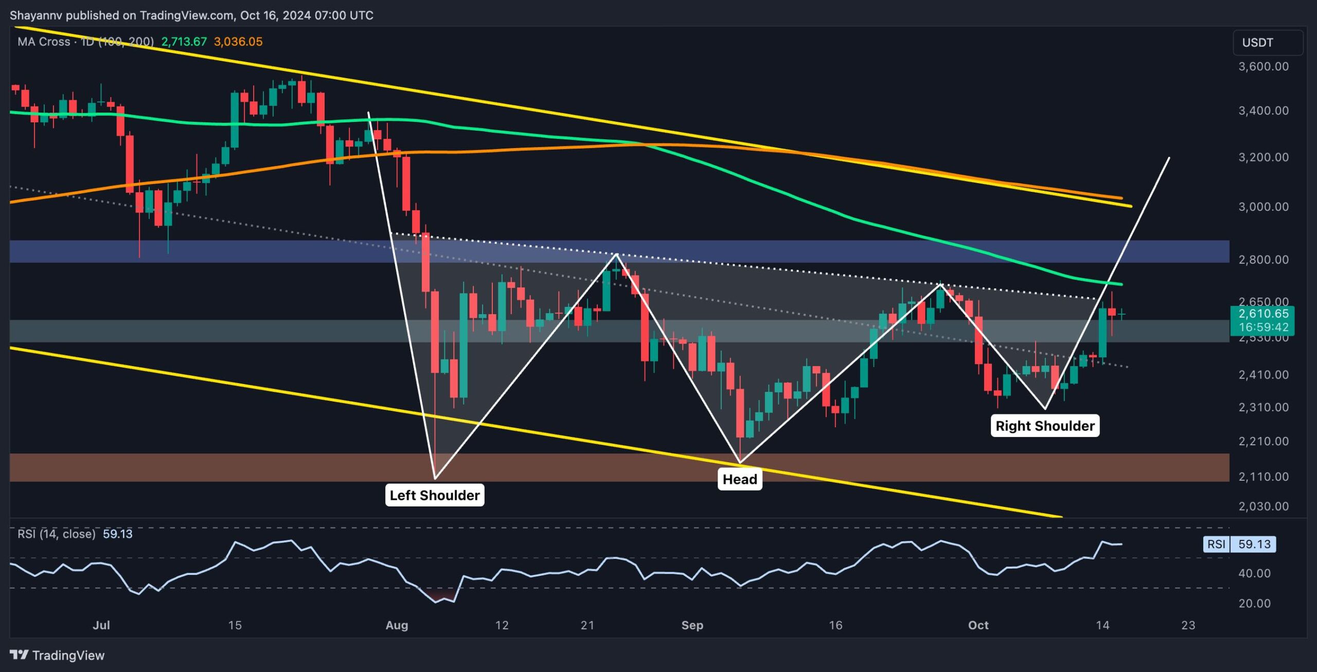 However, the asset is now encountering a substantial resistance region, consisting of the Head and Shoulders (H&S) neckline and the 100-day moving average (MA) at $2.6K.