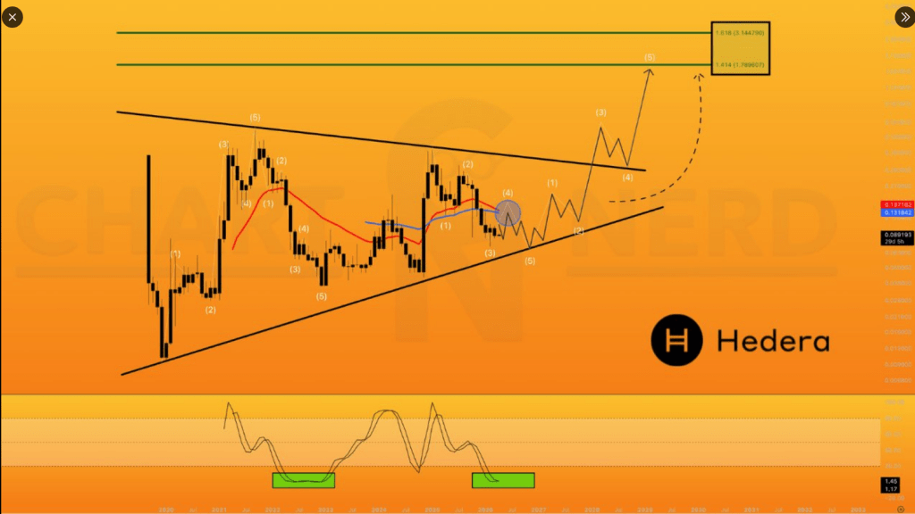 Crypto analyst ChartNerd said a long-range target of $1.80 is still in play, but the setup depends on a clear break above resistance. The chart view in the report points to a converging triangle pattern, with higher lows forming underneath and lower highs pressing down from above. That kind of structure can compress price action for a while before a sharp move takes shape.