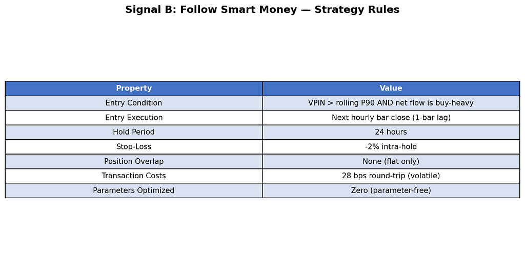 Signal Generation: VPIN > rolling P90 (computed from trailing 500 bars) AND flow_sign > 0 (net buying). Execute at next hourly close. Hold 24h. Stop-loss at -2%.