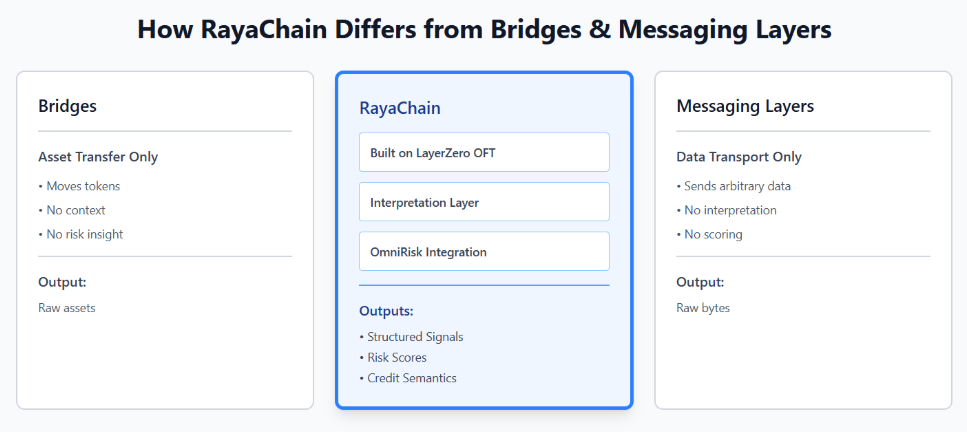 RayaChain uses LayerZero OFT as its transportation method but adds something that neither traditional bridges nor messaging layers provide: an interpretation layer that includes risk and credit semantics. These signals come from OmniRisk’s analysis, which are structured, scored, and ready for use by downstream protocols and applications. The interpretation has already been done. The receiving system does not get raw behavioral data and a problem to solve. Instead, it gets a risk assessment and a basis for decision-making.
