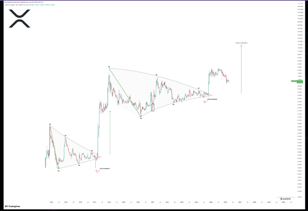 The setup goes back years. According to Marks, XRP formed a large pennant pattern starting in 2017, right after the token’s first major surge.