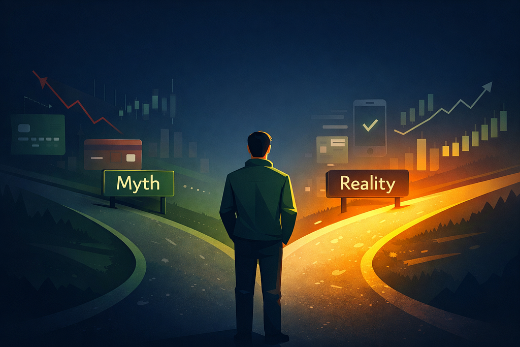 A simple picture of a person standing between two paths one labeled “Myth” and the other “Reality,” with some finance elements like graphs, cards and mobile screens in the background. The picture should have a navy blue colour with warm highlights.
