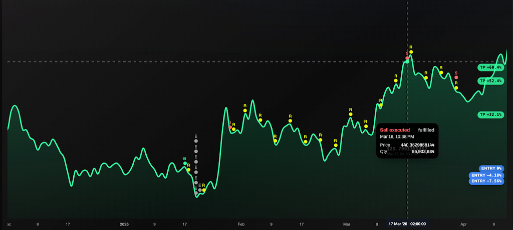 Every dot on this chart is a decision milo made. The January entry. The six weeks of re-evaluations through February. The March breakout. The partial sell at +60% on that tranche. The runner held ten more days.