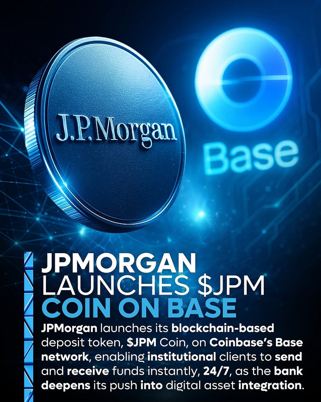 JPMorgan Chase has officially launched $JPM Coin its blockchain-based deposit token on Coinbase’s Base network. This isn’t just a tech upgrade. This is JPMorgan placing a full-throated bet on the decentralized future of finance, giving institutional clients the ability to send and receive funds instantly, 24 hours a day, 7 days a week including weekends, holidays, and every awkward timezone in between.