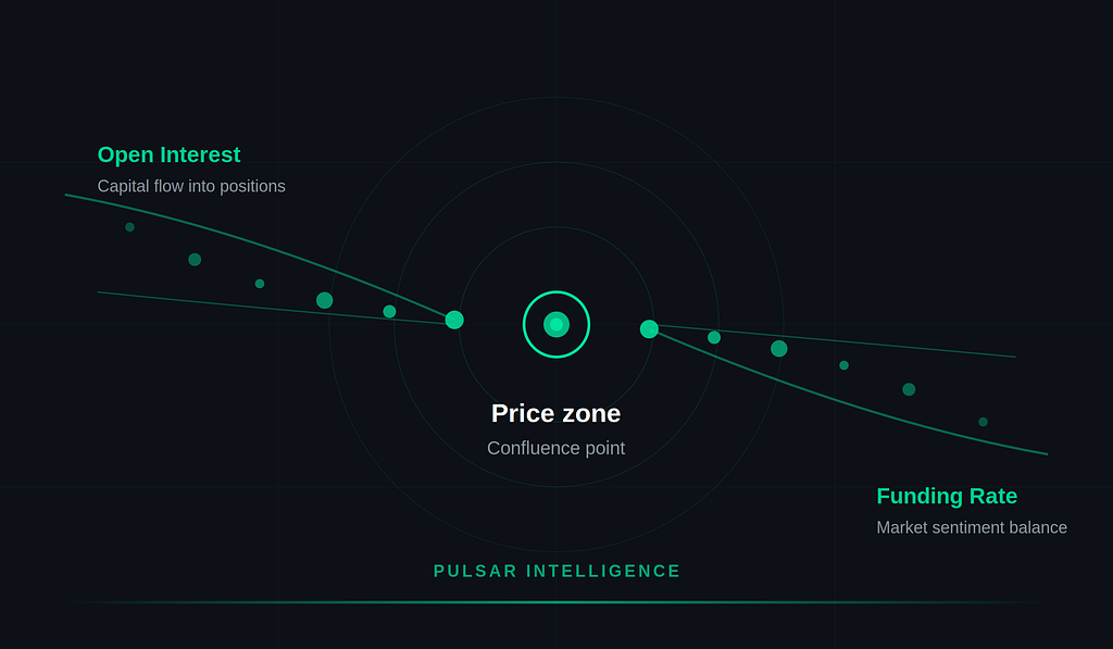 Pulsar Intelligence monitors OI and funding rates across HyperLiquid, Binance and Bybit in real time — combining both with zone intelligence and a 1–10 confidence score on every observation. pulsarintelligence.ai