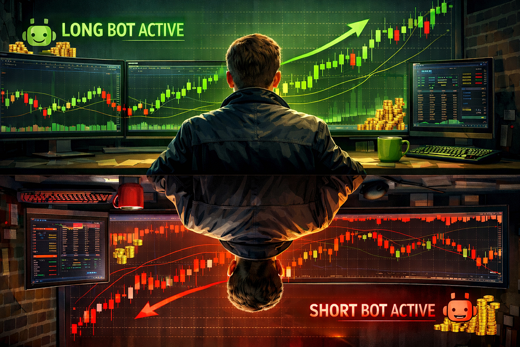 Let’s break down a mirrored setup using two separate 3Commas DCA bots: one designed for uptrends and one for downtrends. When the market is bullish, the Long bot operates. When the market is bearish, the Short bot takes over. Below is a full breakdown of how it works.