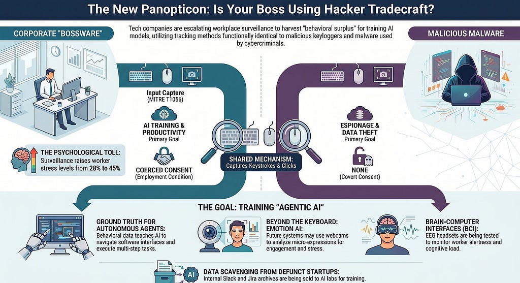 Meta’s decision to track employee keystrokes and mouse movements for AI training is a watershed moment in corporate surveillance. It perfectly illustrates the mechanics of surveillance capitalism applied to the workforce, utilizing techniques indistinguishable from malicious hacker tradecraft to extract behavioral surplus. As the AI industry’s hunger for data drives the commodification of every digital interaction — from the Slack messages of dead startups to the micro-movements of current employees — the fundamental right to privacy in the workplace is being systematically dismantled. Without robust regulatory intervention and a reassertion of digital labor rights, the future of work risks resembling the totalizing surveillance of 1984, optimized not just for control, but for the automated replacement of the workers themselves.