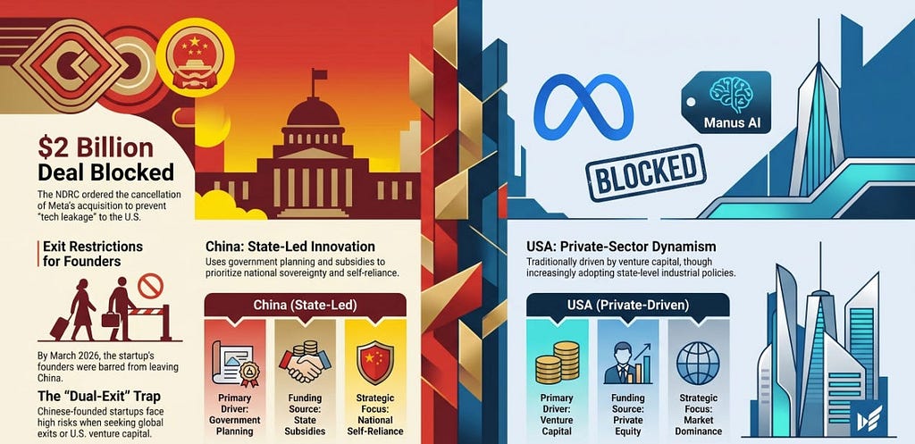 I was honestly very surprised when I heard the news that Meta was buying Manus for $2B in December of 2024. I had and have been using Manus for quite a while now, and find the model very powerful and better than some of the US rivals. SO this news seemed to me great for Meta, which I am not a fan of, and Manus investors looking to cash out, but detrimental for Manus the Model. The decision by China’s National Development and Reform Commission (NDRC) to block Meta Platforms Inc.’s $2 billion acquisition of the agentic AI startup Manus marks a watershed moment in the escalating technological rivalry between Washington and Beijing. This move, announced on April 27, 2026, represents a significant escalation in China’s efforts to prevent the “leakage” of critical artificial intelligence technology to the United States. While the deal was initially seen as a successful exit for a startup with global aspirations, it has now become a cautionary tale for the “dual-exit” risks facing Chinese-founded tech firms.