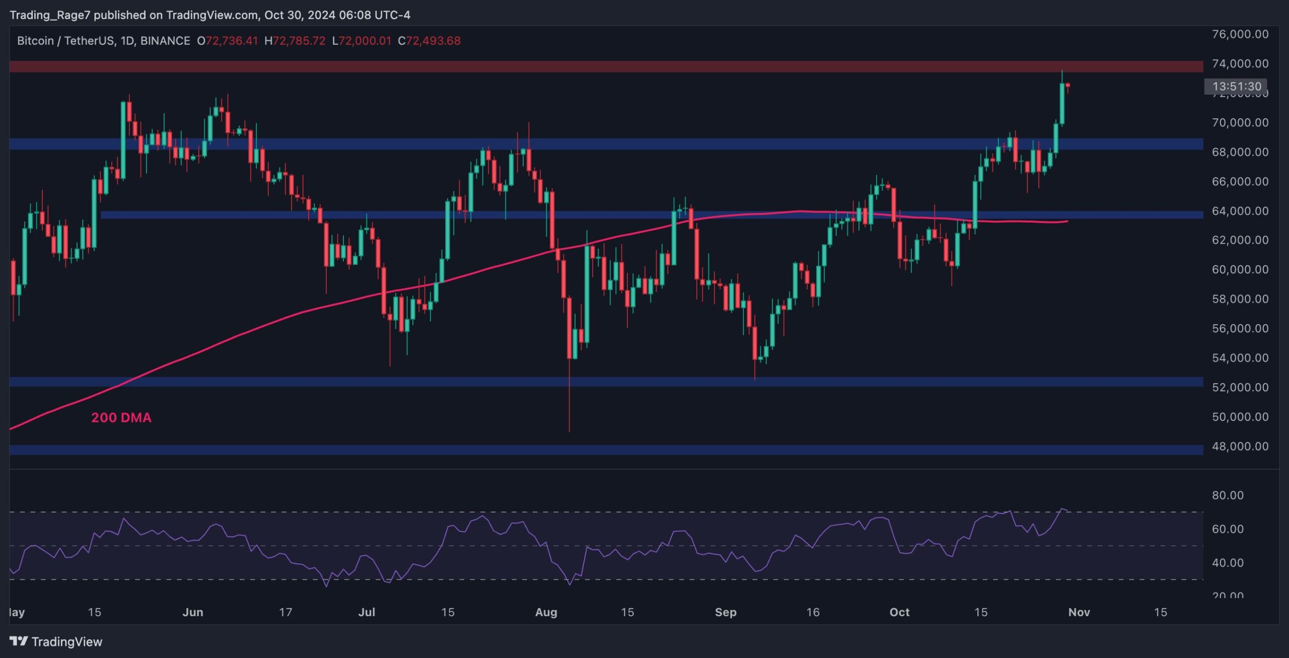 Currently, BTC is testing the $74K resistance zone, which is also its record peak and is highly likely to get broken to the upside, which would potentially lead to a longer-term rally.