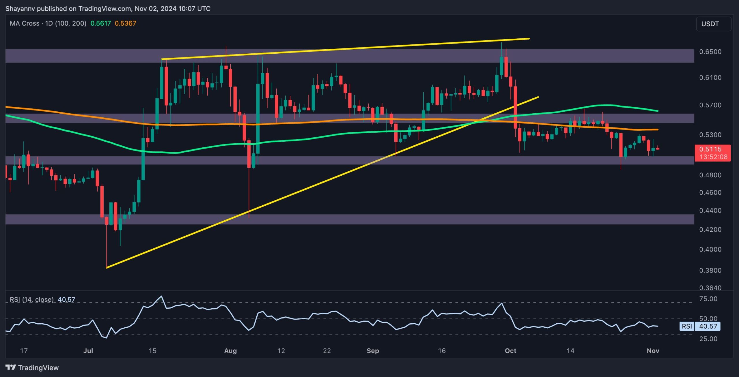 Should the cryptocurrency break above this resistance level, a bullish rebound towards the $0.55 zone is possible. However, given the broader bearish sentiment, a continuation of the consolidation or a bearish breakdown below the $0.5 level appears more likely in the short term. A decisive break below $0.5 would signal a potential sustained downward trend.