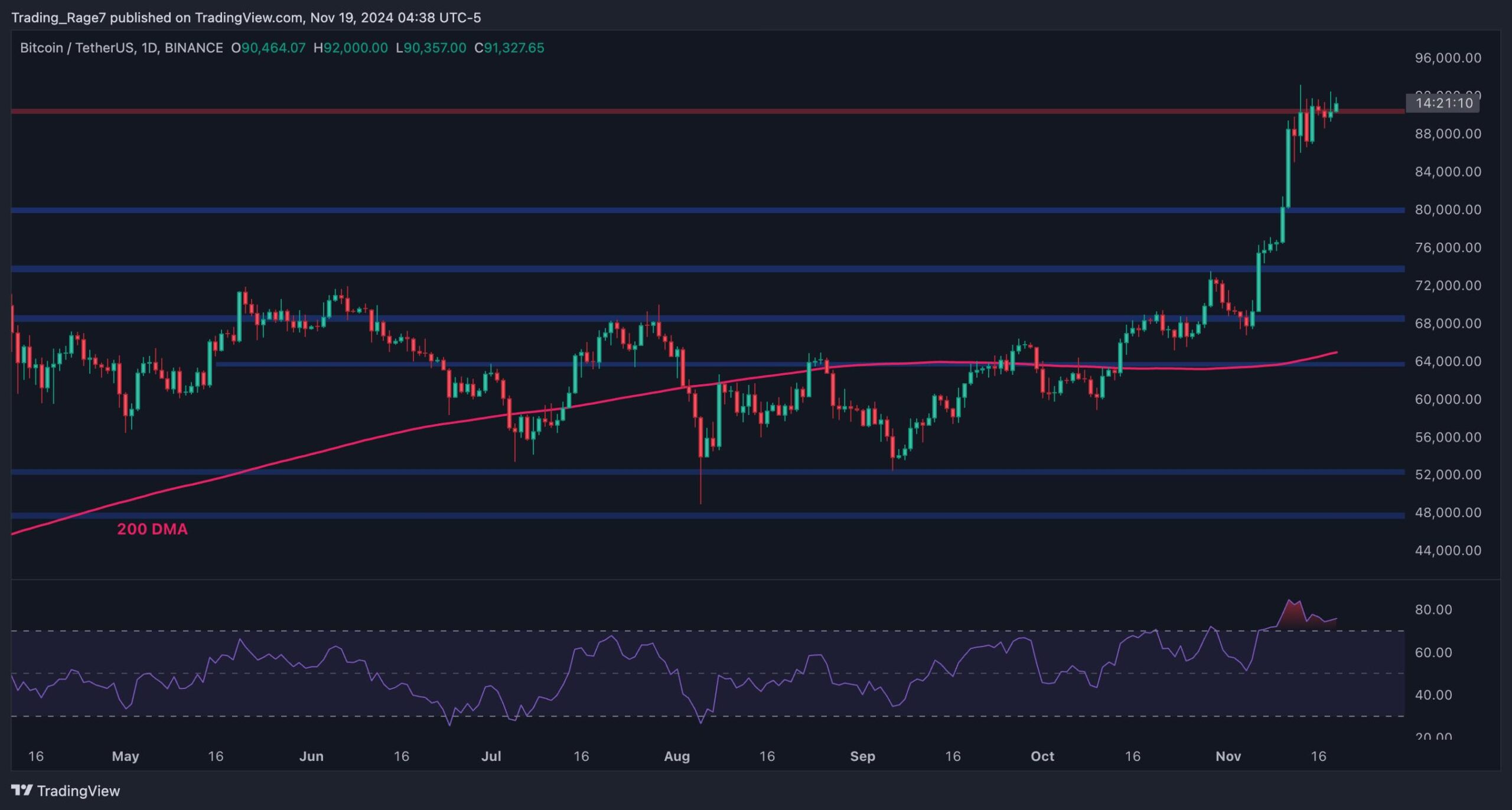 On the daily chart, the asset has been rallying aggressively since breaking above the $74K level. Currently, the market is struggling to get past the $92K mark, as the RSI is also showing an overbought state.