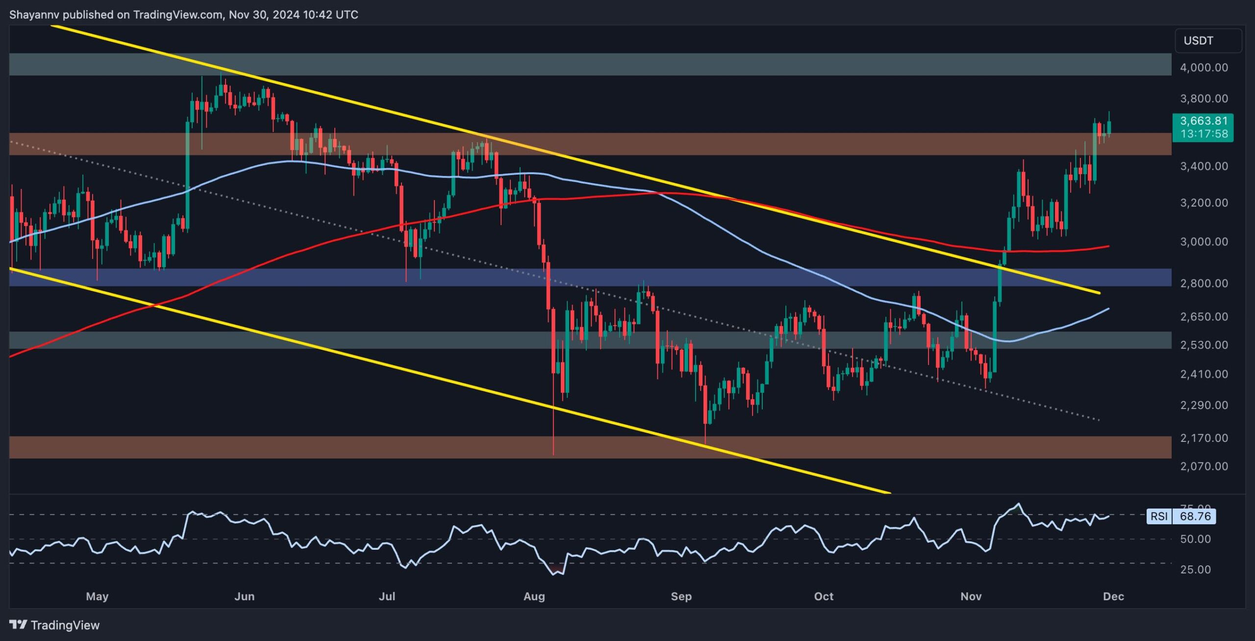 During the 4-hour timeframe, Ethereum’s bullish strength remains evident, with its breakout above the ascending wedge pattern and the critical $3.5K resistance level.