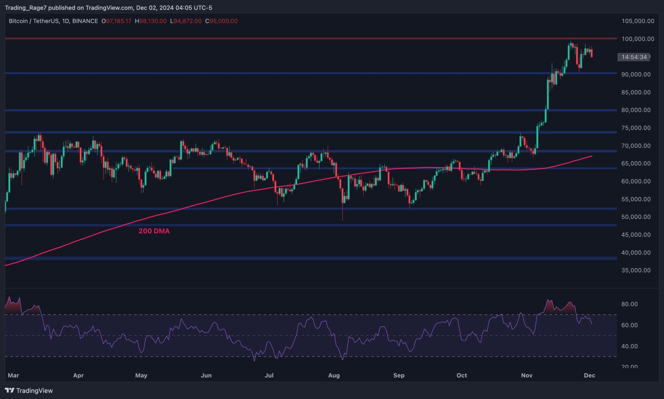 Bitcoin’s price is consolidating below the $100K milestone, as investors are still waiting to witness a six-figure BTC price.