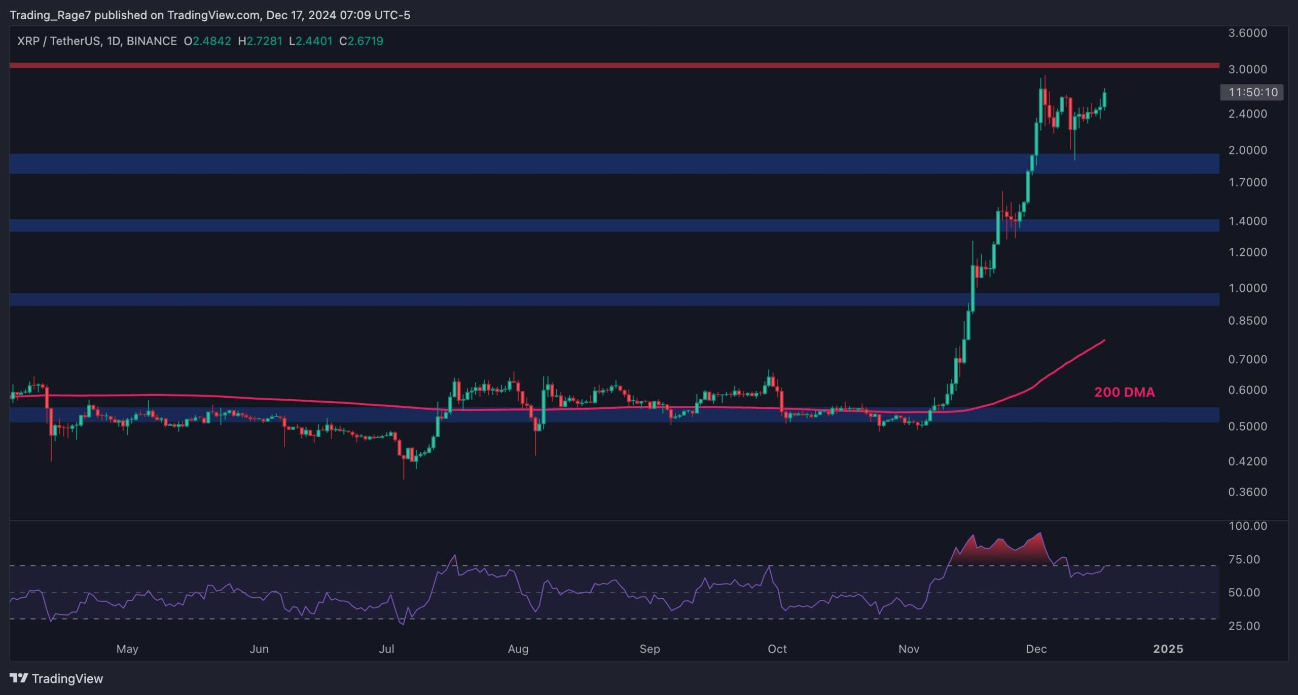 On the USDT paired chart, the price has been surging almost vertically since breaking above the 200-day moving average at the beginning of November. While the market has broken above several resistance levels, it is currently consolidating below the key $3 level.