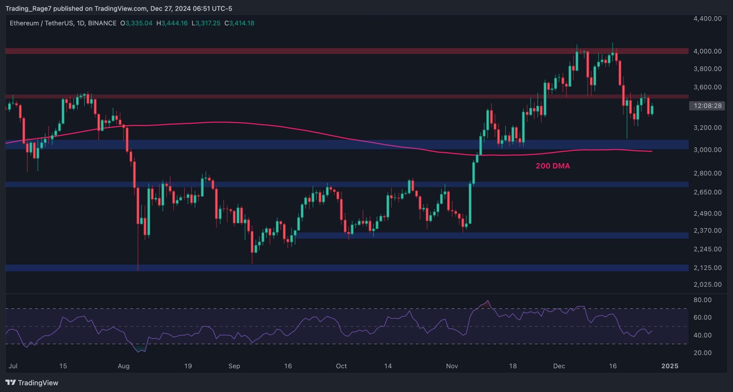 The daily chart shows that Ethereum’s price has formed a clear double-top pattern at the $4,000 resistance level while getting rejected twice. The $3,500 level has also been broken to the downside, and the market has failed to reclaim it following multiple unsuccessful attempts.