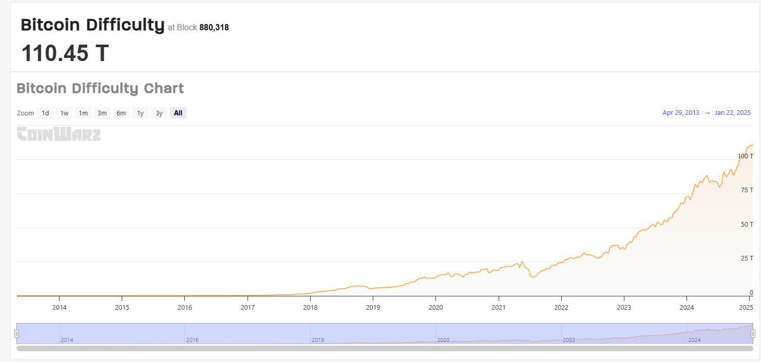 Mining difficulty prevents the network from dispensing 3.125 BTC every 10 minutes or so without adjustment. As of January 22, mining difficulty reached a new all-time high of 110 trillion.