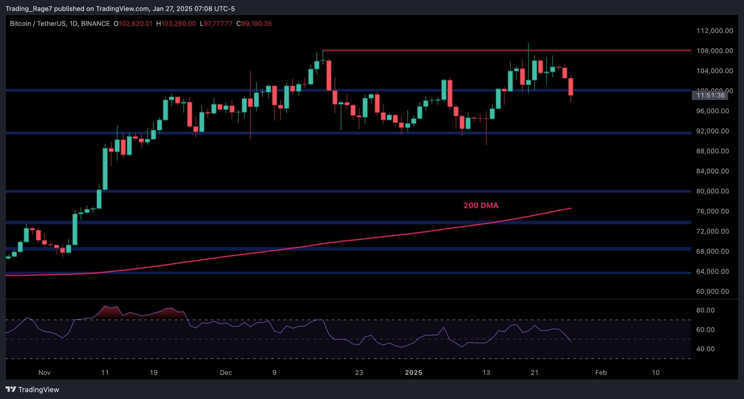 Currently, the price is breaking the $100K level to the downside, which could result in a drop lower toward the $92K area in the coming weeks. With the RSI also dropping below 50%, the momentum on the daily chart is bearish and suggests a correction is bound to happen in the short term.