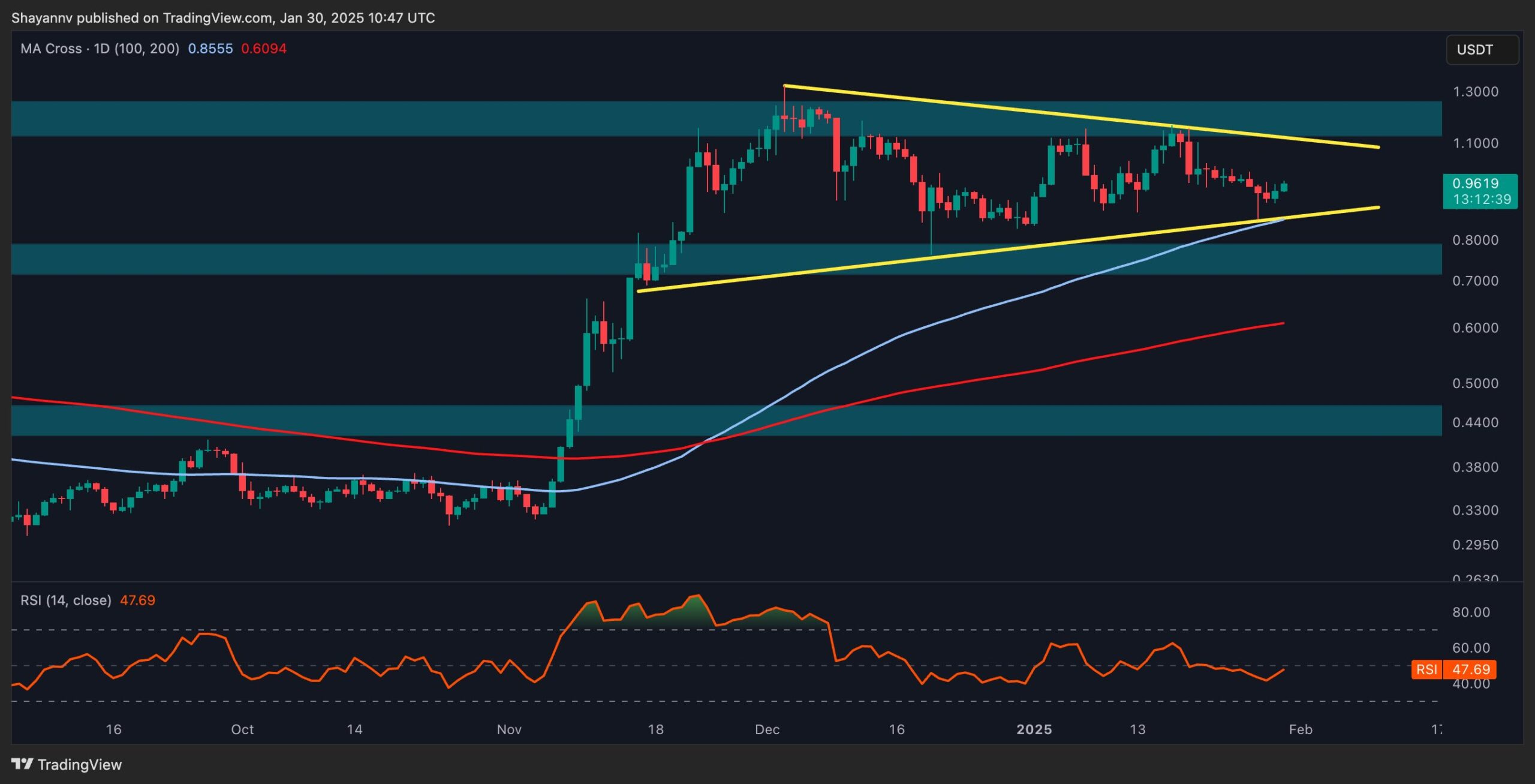 ADA has been consolidating inside a triangle pattern, with the recent price rejection at the upper boundary halting the previous bullish momentum. This rejection led to a decline toward the $0.85 level, which aligns with the 100-day moving average. This price range holds significance as it serves as a major support zone.
