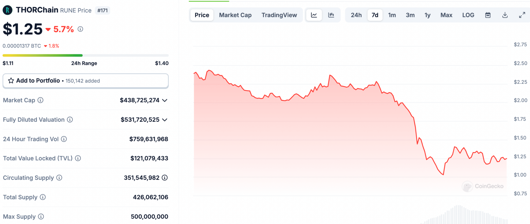 the native token behind the Layer-1 network, THORChain continues to plummet amid concerns of mounting financial issues. One week ago today, RUNE was trading at around $2.45, per Coingecko.