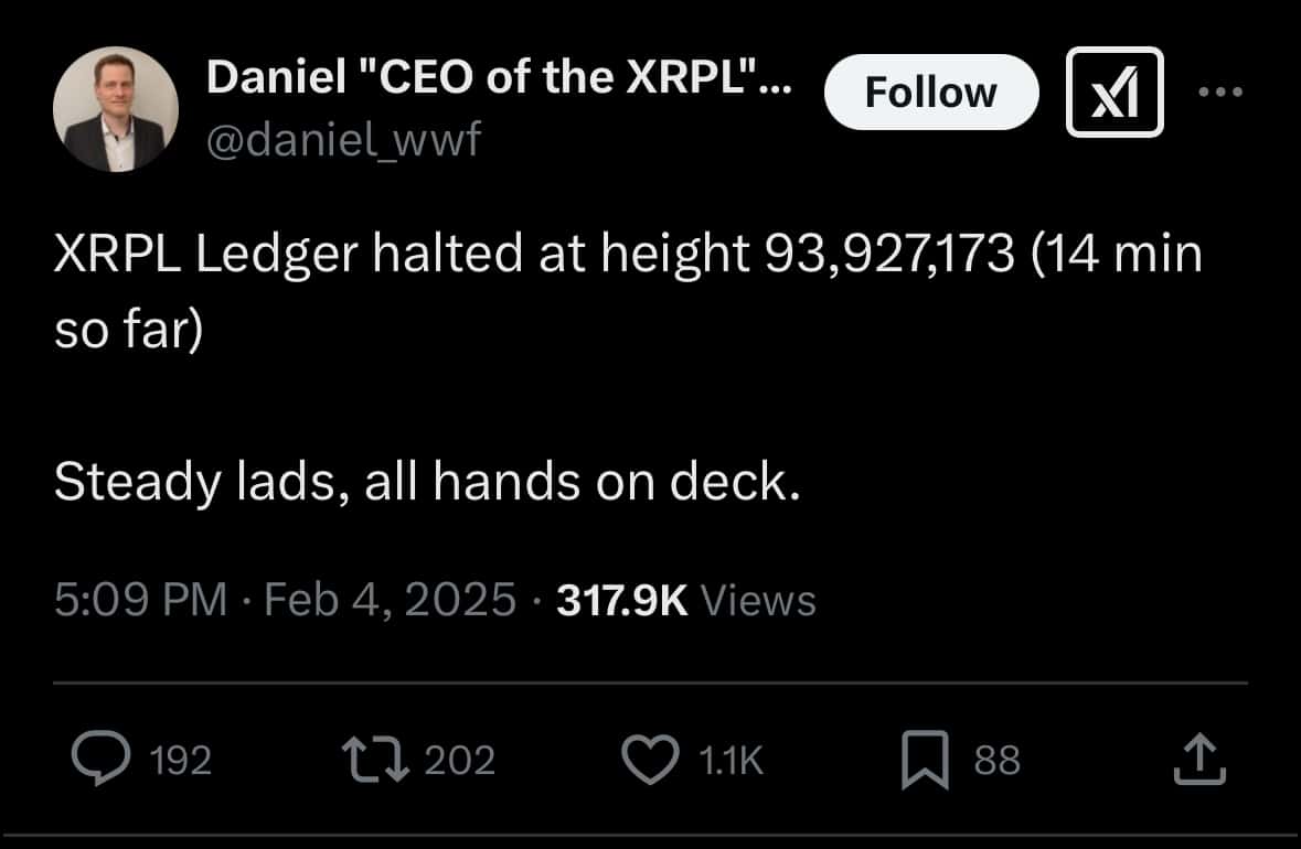 Ripple CTO David Schwartz broke the tension with a meme—“Hello, IT, have you tried turning it on and off again?”—before confirming that the XRPL network was back online. Transactions were running normally, though the underlying issue remained unclear.