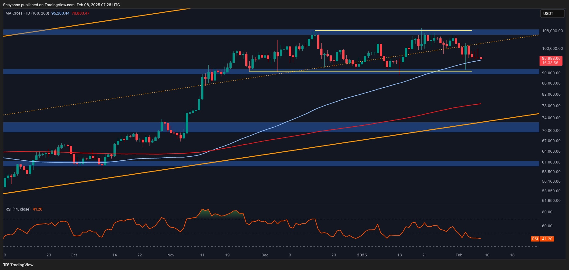 After sustained declines, Bitcoin has approached a crucial support zone where significant demand will likely emerge. This level is particularly important as it aligns with the 100-day moving average and the key psychological support at $95K. A confirmed breakdown below this region could accelerate selling pressure, pushing BTC toward the substantial $90K support area.