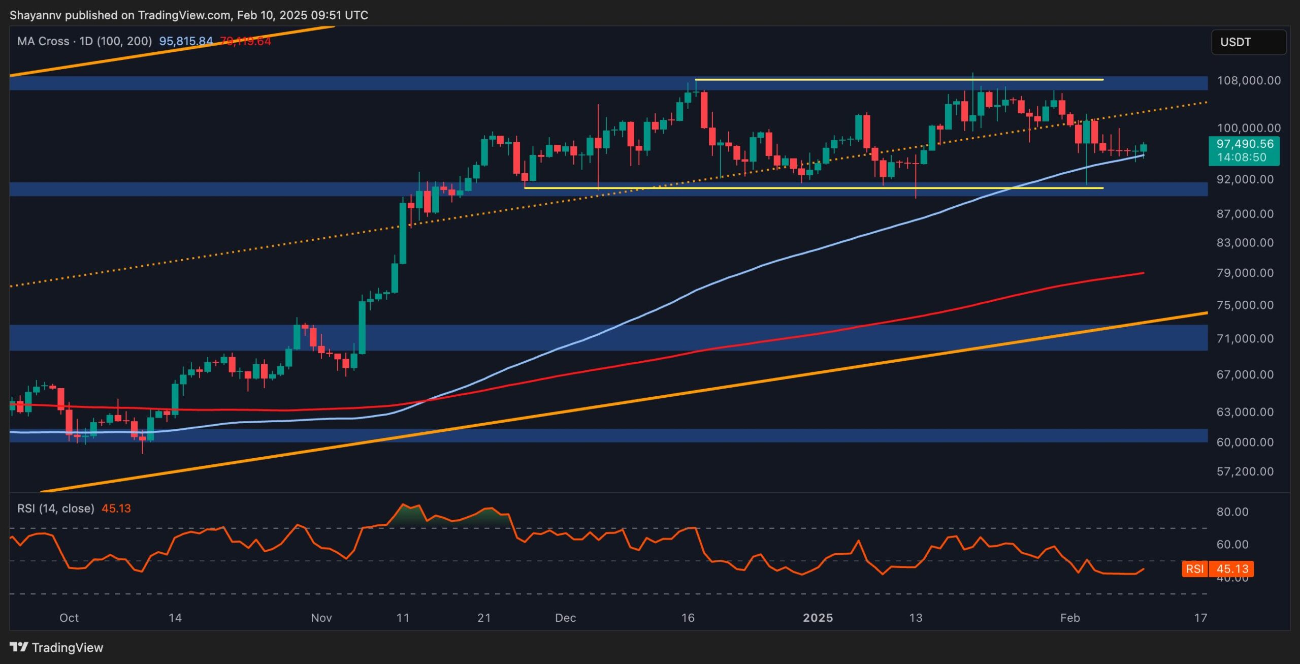 Bitcoin is currently navigating a critical support zone, stabilizing around the 100-day moving average at $95K. This level holds strong significance as it has historically acted as a foundation for bullish rebounds, with buying interest evident at this juncture. Early indications of recovery suggest that bullish momentum may be building, potentially setting the stage for an upward move.