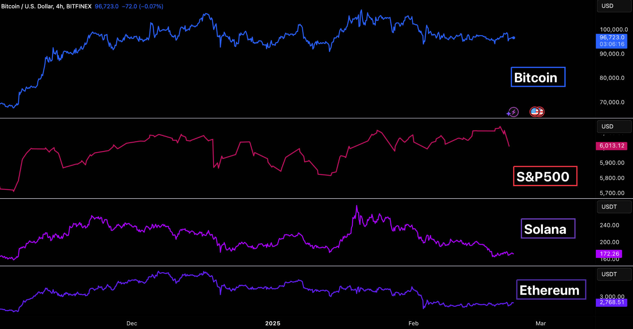 Across the broader crypto market, most major assets have entered a corrective phase following their late-2024 rallies. Bitcoin (-5.9 percent), Ethereum (-16.9 percent), and Solana (-33.1 percent) have all declined in February from rallies in November and December 2024, while Memecoins, which surged in December, have fallen sharply by -37.4 percent.