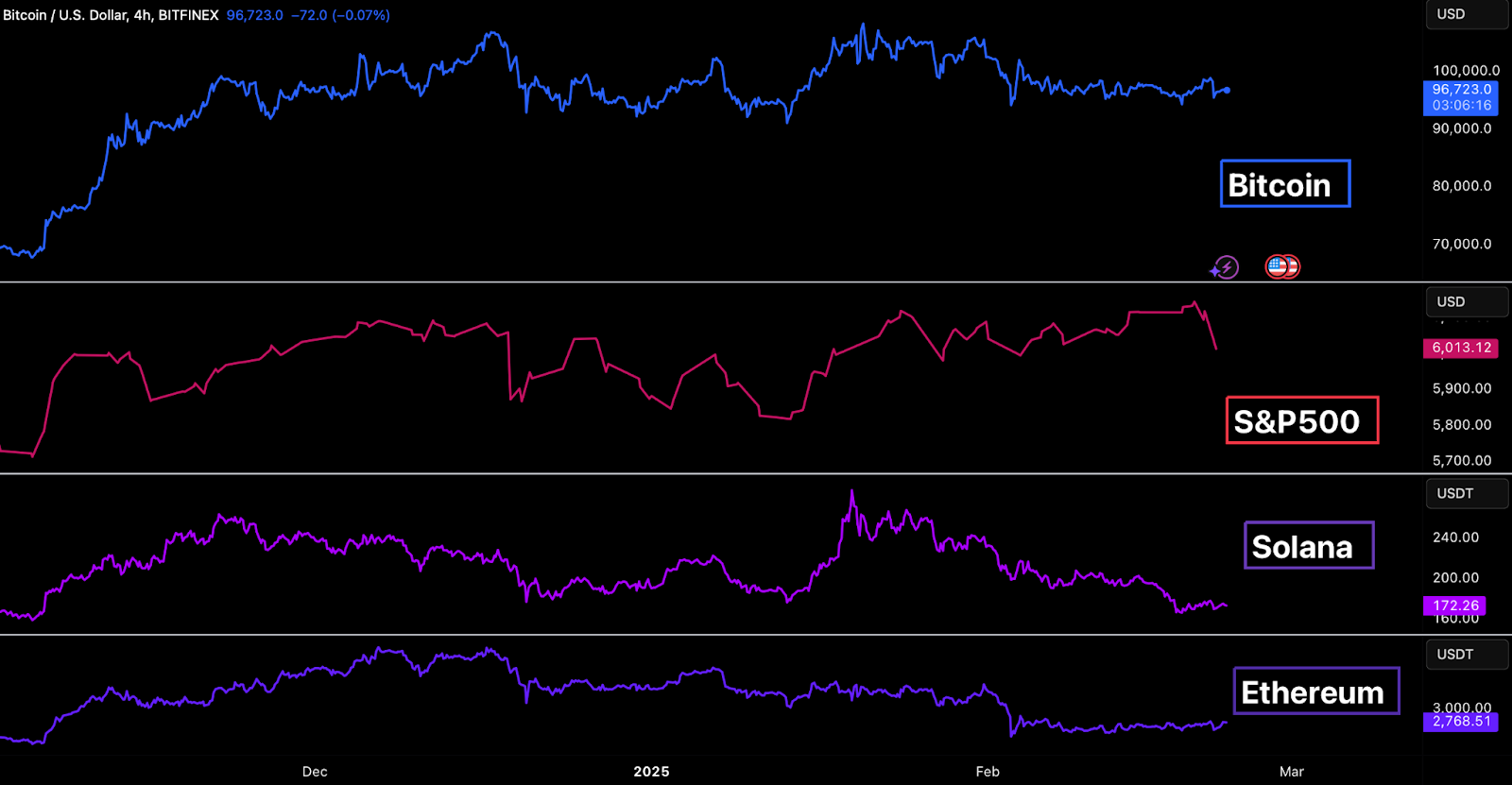 Không chỉ Bitcoin, cả thị trường crypto cũng đang trong giai đoạn điều chỉnh sau những cú bứt phá cuối năm 2024. Bitcoin (-5,9%), Ethereum (-16,9%) và Solana (-33,1%) đều rơi tự do trong tháng 2, sau khi tăng mạnh vào tháng 11 và 12 năm ngoái. Đáng chú ý nhất là nhóm Memecoins, từng bay cao vào tháng 12, nay cũng bay màu tới 37,4%.